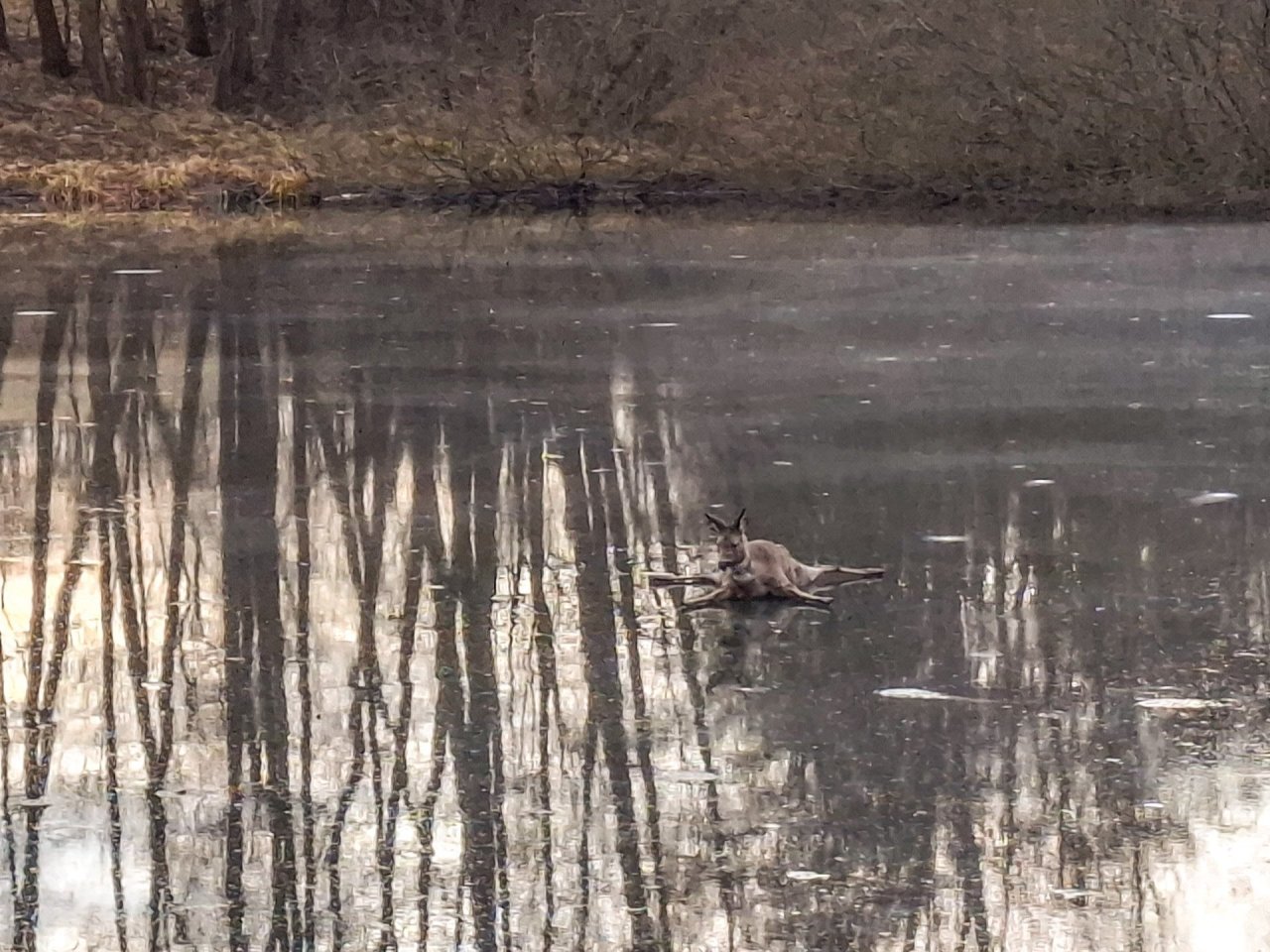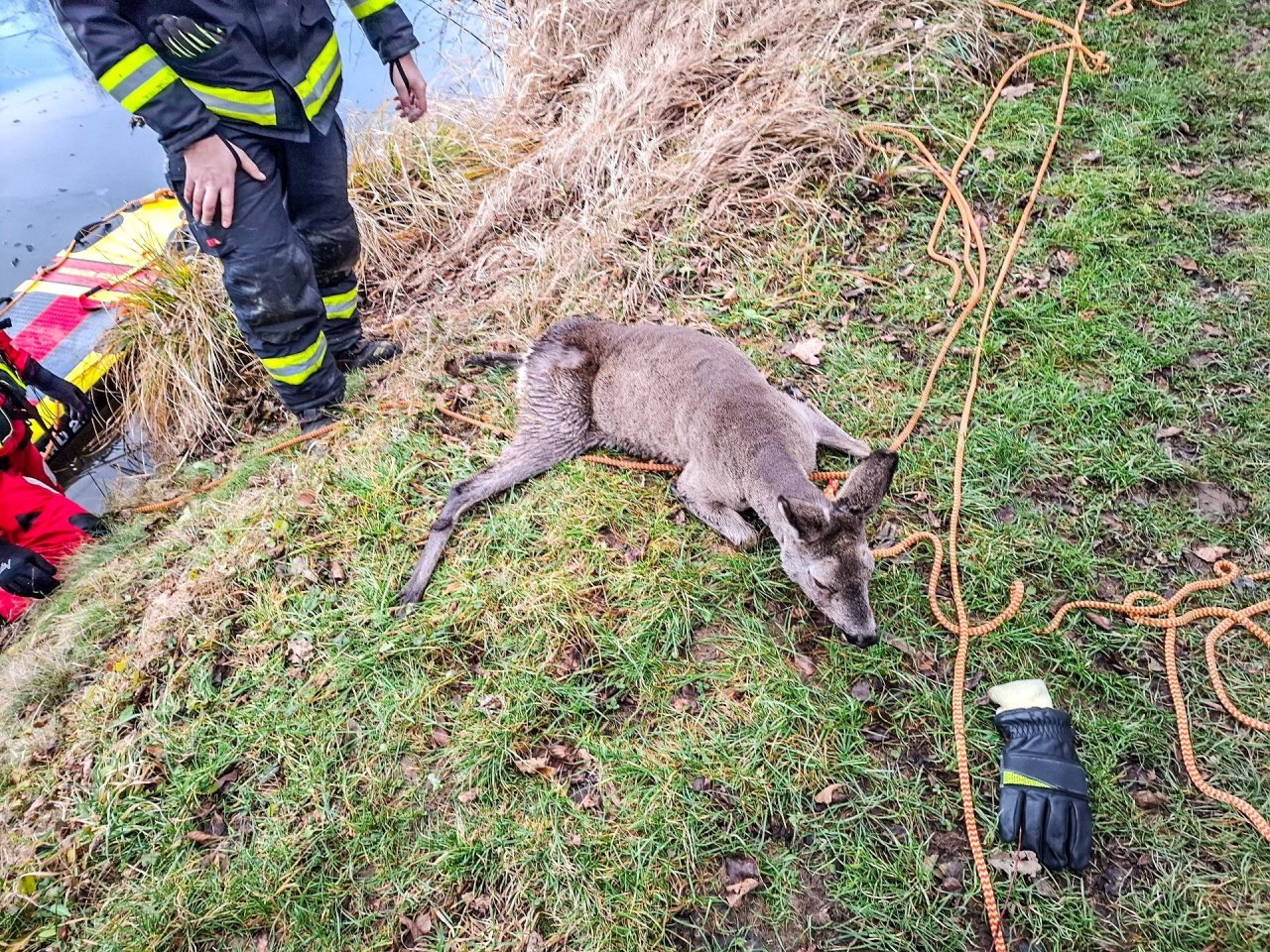 Odvážní hasiči zachránili srnku, která uvízla na rybníku na tenkém ledě