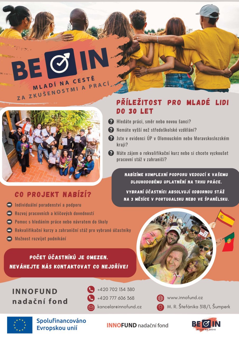 V Olomouckém kraji zahajuje INNOFUND nadační fond nový projekt BE-IN – Mladí na cestě za zkušenostmi a prací, který je určen mladým lidem ve věku 15–29 let včetně. Projekt reaguje na situaci mladých lidí, kteří se nacházejí mimo trh práce a hledají další směr. Zapojit se do něj mohou osoby, které jsou evidovány na Úřadu práce, nebo jsou ekonomicky neaktivní či se potýkají s dalšími překážkami – například se zdravotním znevýhodněním nebo zkušeností s ústavní či náhradní rodinnou péčí.